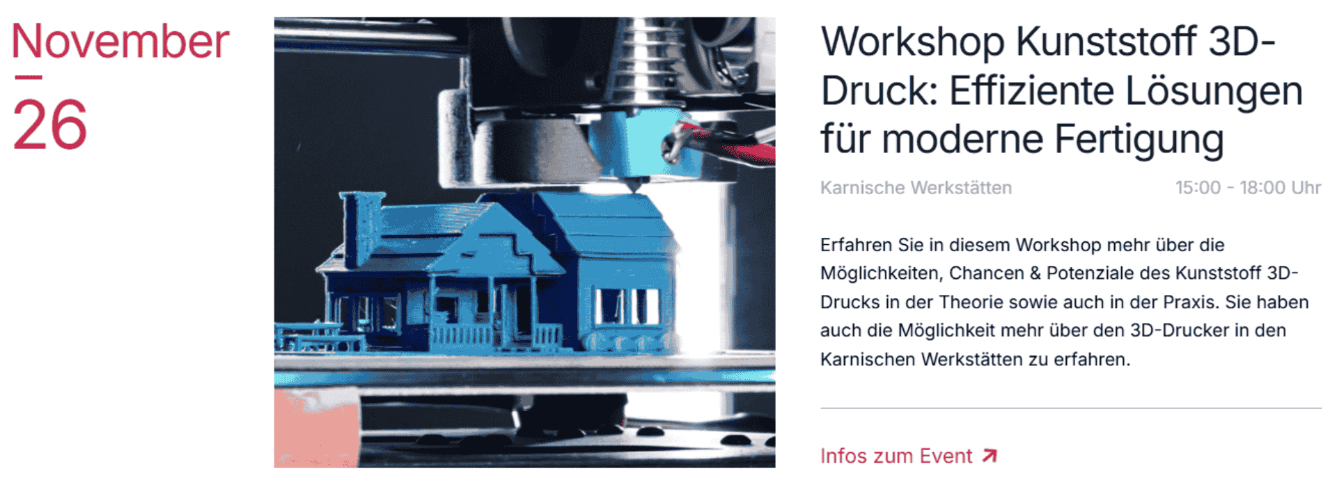 Der kostenlose 3D Druck Workshop "Kunststoff 3D-Druck: Effiziente Lösungen für moderne Fertigung" gibt eine gute Einführung in den 3D Druck, beantwortet wesentliche Fragen. Ein Einstieg in das eigene Arbeiten oder das gemeinsame Arbeiten mit den jugendlichen Profis.